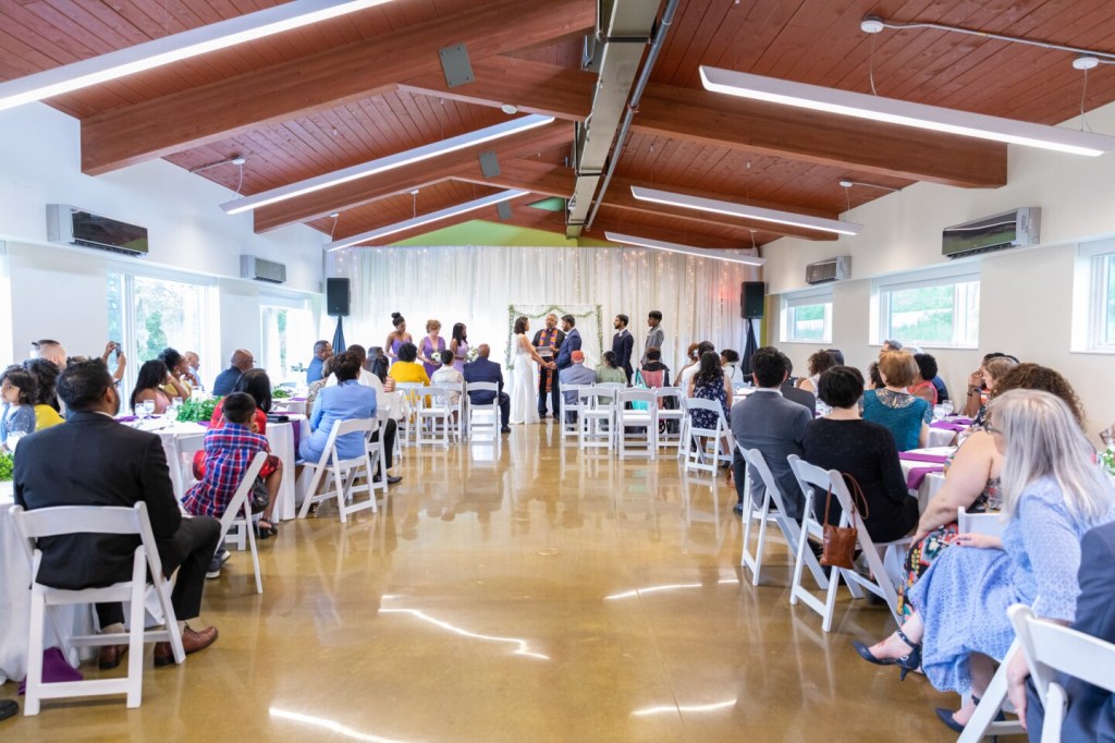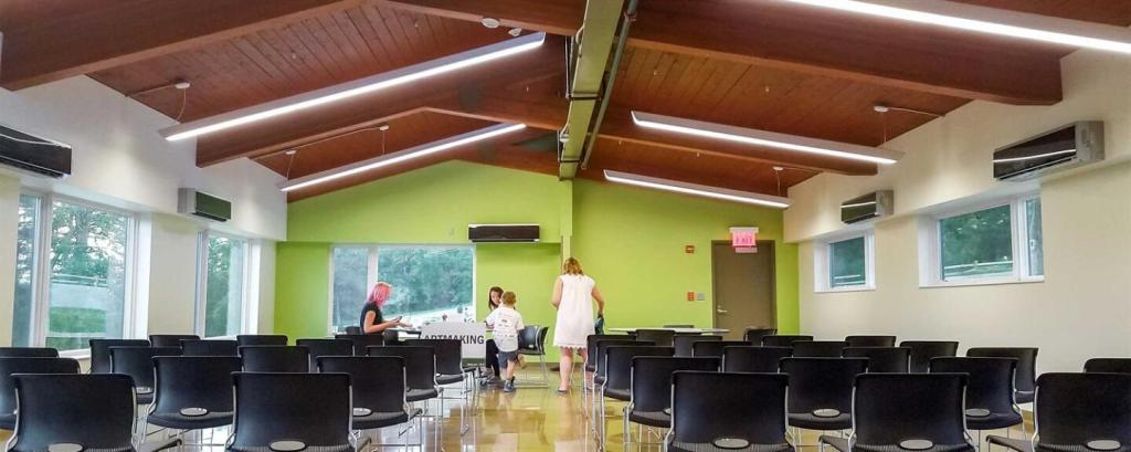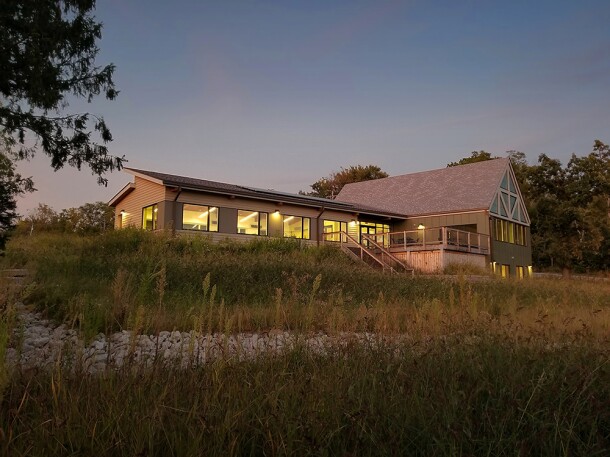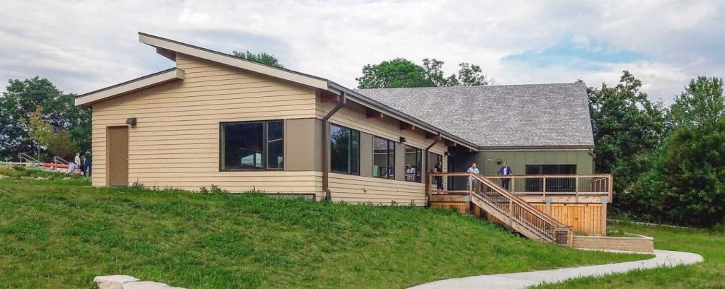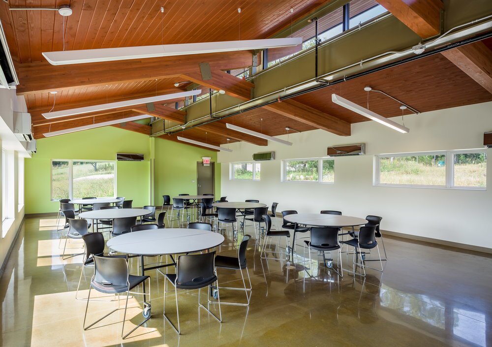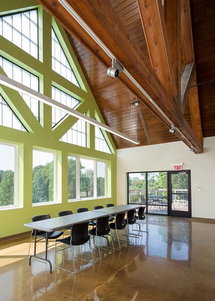 The LEED-Platinum certified building includes a large meeting/event space that accommodates up to 80 guests and a smaller room for meetings that seats 20. Both rooms have easy access to the outdoor patio area on the ground level and a deck that overlooks a scenic lake offering a beautiful view.